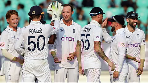 இந்தியா - இங்கிலாந்து இடையிலான மூன்றாவது டெஸ்ட் ராஜ்கோட்டில் நடைபெற்று வருகிறது. முதல் இன்னிங்ஸில் இந்திய அணி 445 ரன்கள் குவித்தது. இதைத் தொடர்ந்து விளையாடிய இங்கிலாந்து அணி 319 ரன்களுக்கு ஆட்டமிழந்தது. 2-வது இன்னிங்ஸை தொடங்கிய இந்திய அணி 3-வது நாள் முடிவில் 2 விக்கெட்டுகள் இழப்புக்கு 196 ரன்கள் எடுத்து வலுவான நிலையில் இருந்தது. ஷுப்மன் கில் 65 ரன்களும், குல்தீப் யாதவ் 3 ரன்களும் எடுத்துக் களத்தில் இருந்தார்கள். இந்நிலையில் இன்று (ஞாயிற்றுக்கிழமை) 4-வது நாள் ஆட்டம் நடைபெற்று வருகிறது. தொடர்ந்து அதிரடியாக விளையாடிய கில் 2 சிக்ஸர்கள், 9 பவுன்ண்டரிகளுடன் 91 ரன்கள் எடுத்து எதிர்பாராத விதமாக ரன் அவுட் ஆனார். இதன் பிறகு ரிடையர்ட் ஹர்ட் ஆன ஜெயிஸ்வால் மீண்டும் களத்திற்கு திரும்பினார். அவருடன் பக்கபலமாக சர்ஃபராஸ் கான் ஜோடி சேர்ந்தார். இருவரும் அணியின் ரன்களை வேகமாக உயர்த்தினர். சர்ஃபராஸ் கான் தனது 2-வது அரைசதத்தைப் பதிவு செய்தார். மறுபக்கம் ஜெயிஸ்வால் இரட்டைச் சதம் அடித்தார். இதைத் தொடர்ந்து 2-வது இன்னிங்ஸில் 4 விக்கெட் இழப்புக்கு 430 ரன்கள் குவித்து டிக்ளேர் செய்தது இந்திய அணி. இதனால் இங்கிலாந்து அணிக்கு 557 ரன்கள் இலக்காக நிர்ணயிக்கப்பட்டது. ஜெயிஸ்வால் 214 ரன்களும், சர்ஃபராஸ் கான் 68 ரன்களும் எடுத்து கடைசி வரை ஆட்டமிழக்காமல் இருந்தனர்.