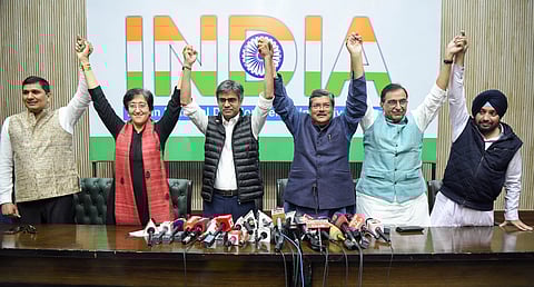 இண்டியா கூட்டணியில் காங்கிரஸ், ஆம் ஆத்மி இடையே கூட்டணி இறுதியானதாகத் தகவல்கள் வெளியாகி வந்தன. பஞ்சாபில் ஆம் ஆத்மி தனித்துப் போட்டியிடுவதாக அறிவித்தாலும்கூட, தில்லி உள்ளிட்ட மற்ற மாநிலங்களில் இண்டியா கூட்டணியில் அங்கம் வகிப்பதாகப் பேசப்பட்டு வந்தன. இந்த நிலையில், தில்லி, குஜராத், ஹரியாணா, சண்டிகர் மற்றும் கோவா ஆகிய இடங்களில் தொகுதிப் பங்கீடு இறுதியாகியுள்ளது. இதைத் தொடர்ந்து, காங்கிரஸ் மற்றும் ஆம் ஆத்மி கட்சித் தலைவர்கள் தில்லியில் இன்று கூட்டாகச் செய்தியாளர்களைச் சந்தித்தார்கள்.