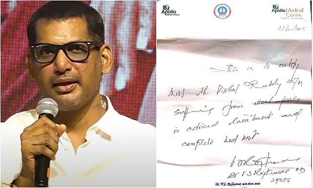 இந்த நிலையில், விஷாலுக்கு வைரஸ் காய்ச்சல் இருப்பதாக அப்போலோ மருத்துவமனை மருத்துவரின் மருத்துவக் குறிப்பு வெளியாகியுள்ளது. காய்ச்சலுக்கான சிகிச்சைப் பெற்றுக்கொண்டு, முழு ஓய்வில் இருக்க வேண்டும் என்று விஷாலுக்கான மருத்துவக் குறிப்பில் மருத்துவர் அறிவுறுத்தியுள்ளார்.