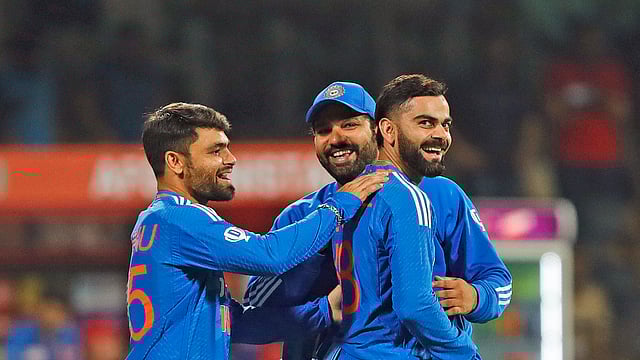 இதன் பிறகு துபே 1 ரன்னிலும், சாம்சன் ரன் எதுவும் எடுக்காமலும் வெளியேற 4.3 ஓவர்களில் 22 ரன்களுக்கு 4 விக்கெட்டுகளை இழந்தது இந்திய அணி. ஃபரீத் அஹமத் அருமையாகப் பந்துவீசி 3 விக்கெட்டுகளை வீழ்த்தினார். ஒரு பக்கம் வேகமாக விக்கெட்டுகள் வீழ்ந்தாலும், மற்றொரு பக்கத்தில் கேப்டன் ரோஹித் சர்மா அதிரடியாக விளையாடினார். அவருடன் ஜோடி சேர்ந்த ரிங்கு சிங் அணியின் ஸ்கோரை உயர்த்த உதவினார். தொடர்ந்து அதிரடியாக விளையாடிய ரோஹித் சர்மா தனது 5-வது டி20 சதத்தை விளாசினார். இதன் மூலம் டி20-யில் அதிக சதம் அடித்த வீரர் என்ற சாதனையையும் படைத்தார் ரோஹித் சர்மா.