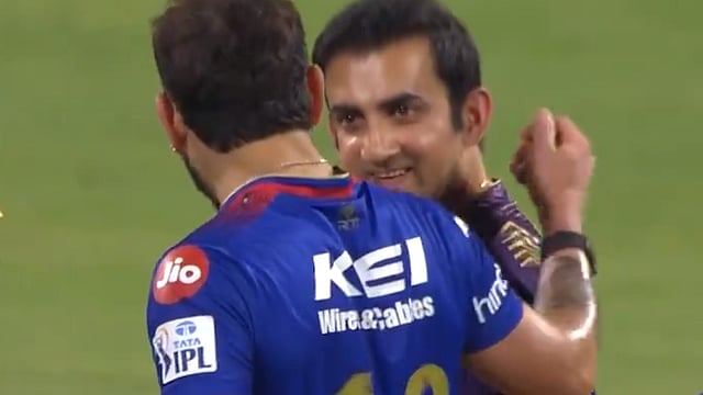 ஆர்சிபி - கேகேஆர் இடையிலான ஆட்டத்தில் கோலி, கம்பீர் ஆகியோர் கைக்குலுக்கி, அரவணைத்து தங்களின் அன்பை வெளிப்படுத்தினர்.