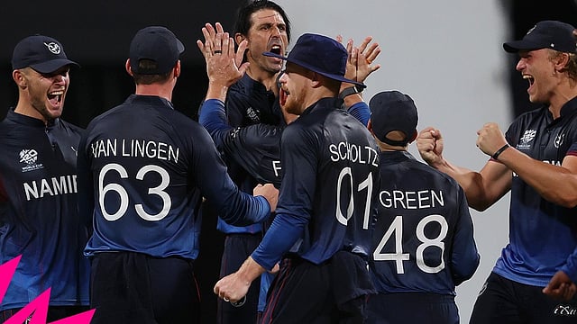 ஓமனுக்கு எதிரான ஆட்டத்தில் நமீபிய அணி 10 ரன்கள் வித்தியாசத்தில் சூப்பர் ஓவரில் வெற்றி பெற்றது.