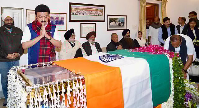 மறைந்த முன்னாள் இந்தியப் பிரதமர் மன்மோகன் சிங் உடலுக்கு அஞ்சலி செலுத்தினார் தமிழக முதல்வர் மு.க. ஸ்டாலின்.