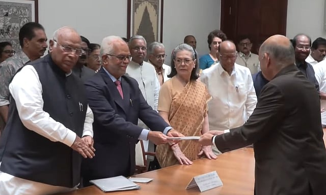 இண்டியா கூட்டணியைச் சேர்ந்த காங்கிரஸ் தேசியத் தலைவர் மல்லிகார்ஜுன் கார்கே, மூத்த தலைவர் சோனியா காந்தி, ராகுல் காந்தி, சரத் பவார், பா. சிதம்பரம், ராம் கோபால் யாதவ், திருச்சி சிவா, சஞ்சய் ராவத், என். பிரேமசந்திரன் உள்ளிட்டோர் உடனிருந்தனர்.