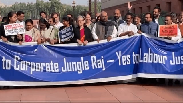 இந்நிலையில், நாடாளுமன்ற குளிர்காலக் கூட்டத்தொடரின் மூன்றாம் நாள் அமர்வு தொடங்குவதற்கு முன்னதாக இண்டியா கூட்டணிக் கட்சிகளைச் சேர்ந்த நாடாளுமன்ற உறுப்பினர்கள், புதிய தொழிலாளர் சட்டங்களுக்கு எதிராக முழக்கங்கள் எழுப்பி, போராட்டம் நடத்தினர். அப்போது, கார்ப்ரேட் காட்டாட்சி வேண்டாம், தொழிலாளர்களுக்கு நீதி வேண்டும் என்ற பதாகைகளை ஏந்தி போராட்டம் நடத்தினர். இதில், நாடாளுமன்ற எதிர்க்கட்சித் தலைவர் ராகுல் காந்தி, காங்கிரஸ் குழுத் தலைவர் சோனியா காந்தி, நாடாளுமன்ற உறுப்பினர் பிரியங்கா காந்தி, காங்கிரஸ் தேசிய தலைவர் மல்லிகார்ஜுன கார்கே, திமுக நாடாளுமன்ற உறுப்பினர் கனிமொழி உள்ளிட்டோர் கலந்துகொண்டார்கள்.