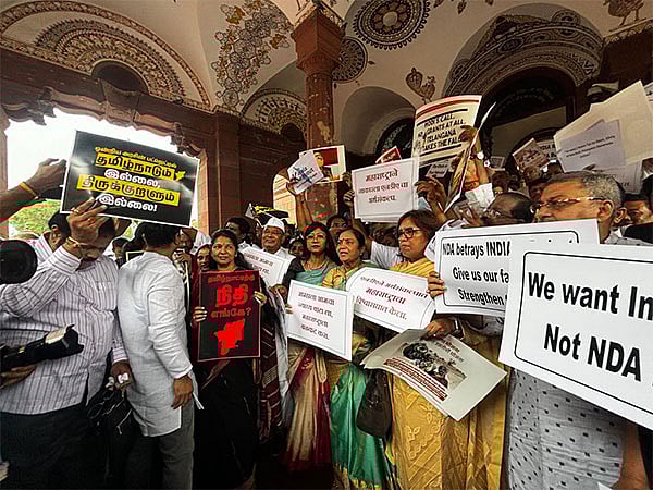 இந்த அறிவிப்பை செயல்படுத்தும் வகையில் இன்று (ஜூலை 24) காலை நாடாளுமன்ற வளாகத்தில் போராட்டத்தை நடத்தினார்கள் இண்டியா கூட்டணி எம்.பி.க்கள். அப்போது `தமிழ்நாட்டுக்கு நிதி எங்கே?, இது பாராபட்சமான பட்ஜெட், தேசிய ஜனநாயக கூட்டணி இந்தியாவைப் புறக்கணித்துவிட்டது, தமிழ்நாடும் இல்லை திருக்குறளும் இல்லை’ போன்ற பதாதைகளை ஏந்தியிருந்தனர்.
