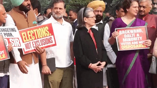 இந்நிலையில் இன்று காலை நாடாளுமன்ற கூட்டத் தொடர் தொடங்குவதற்கு அரை மணி நேரம் முன்னர், வளாகத்தின் வாசலில் திரண்ட இண்டியா கூட்டணி கட்சிகளின் நாடாளுமன்ற உறுப்பினர்கள் சிறப்பு தீவிர திருத்தத்திற்கு எதிராக பதாகைகளை ஏந்தி, முழக்கங்கள் எழுப்பி போராட்டம் நடத்தினர். அதில், காங்கிரஸ் கட்சியின் முக்கிய தலைவர்களான மல்லிகார்ஜுன கார்கே, சோனியா காந்தி, ராகுல் காந்தி, பிரியங்கா காந்தி ஆகியோர் பங்கேற்றனர்.