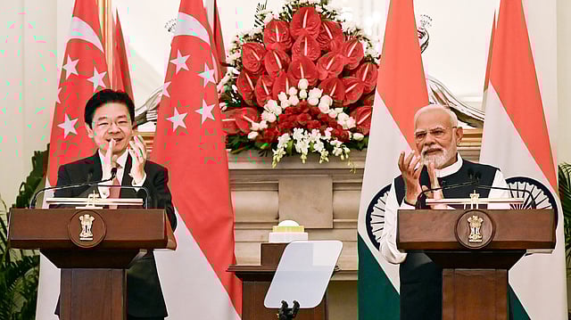 சிங்கப்பூர் பிரதமர் லாரன்ஸ் வோங், 3 நாள் அரசு முறை பயணமாக இந்தியா வந்துள்ளார். அவர் தில்லியில் உள்ள பிரதமர் மோடியை சந்தித்து பேசினார். அப்போது சிங்கப்பூர் - இந்தியாவுக்கு இடையே உறவை வலுப்படுத்துவது குறித்து இருநாட்டு தலைவர்களும் ஆலோசனை நடத்தினர். தொடர்ந்து, இருநாடுகளுக்கு இடையே புரிந்துணர்வு ஒப்பந்தம் கையெழுத்தானது. பின்னர் பிரதமர் மோடி, சிங்கப்பூர் பிரதமர் லாரன்ஸ் வோங் ஆகிய இருவரும் கூட்டாக நிருபர்களை சந்தித்தனர்.