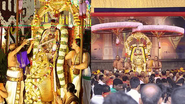 இதில், தினமும் பிரமாண்டமான அளவில் வாகன சேவைகள் நடைபெறும். அதன்படி இரண்டாம் நாளான நேற்று (செப்.25), காலை ஸ்ரீதேவி பூதேவி சமேதராக மலையப்ப ஸ்வாமி சின்ன சேஷ வாகனத்தில் எழுந்தருளினார். அதைத் தொடர்ந்து இரவு அன்னப்பறவை (அம்ச) வாகனத்தில் வெண்பட்டு அணிந்து கையில் வீணை ஏந்தி மலையப்ப ஸ்வாமி எழுந்தருளினார். இதனைத் திரளாகப் பங்கேற்ற பக்தர்கள் கண்டு களித்தனர். சுவாமி புறப்பாட்டுக்கு முன் பல்வேறு கலை நிகழ்ச்சிகள் நடத்தப்பட்டன.