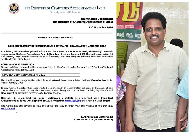 வரும் 2025 ஜனவரியில் நடைபெறவுள்ள சி.ஏ. பவுண்டேஷன் தேர்வுகளின் அட்டவணையை சமீபத்தில் வெளியிட்டது இந்திய பட்டய கணக்காளர்கள் நிறுவனம். இதன்படி, பொங்கல் பண்டிகை (14.01.2024) அன்று Business laws தேர்வும், உழவர் திருநாள் (16.01.2024) அன்று Quantitative Aptitude தேர்வும் நடைபெறும் என அறிவிக்கப்பட்டிருந்தது.