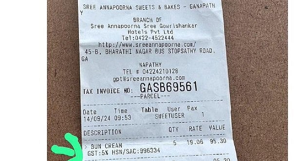 கடந்த செப்.14-ம் தேதியிட்ட கோவை கணபதி அன்னபூர்ணா ஹோட்டல் கிளையின் ரசீதில், க்ரீம் பன்னுக்கு 5 சதவீத ஜிஎஸ்டி விதிக்கப்பட்டிருக்கிறது. இதை அடுத்து செப்.15-ம் தேதியிட்ட கோவை பெரிய கடை வீதி அன்னபூர்ணா ஹோட்டல் கிளையின் ரசீதில் க்ரீம் பன்னுக்கு 18 சதவீத ஜிஎஸ்டி விதிக்கப்பட்டிருக்கிறது. இந்த வேறுபாடான ஜிஎஸ்டி வரிவிதிப்பு மீண்டும் சமூக வலைதளங்களில் பேசு பொருளாகியுள்ளது.