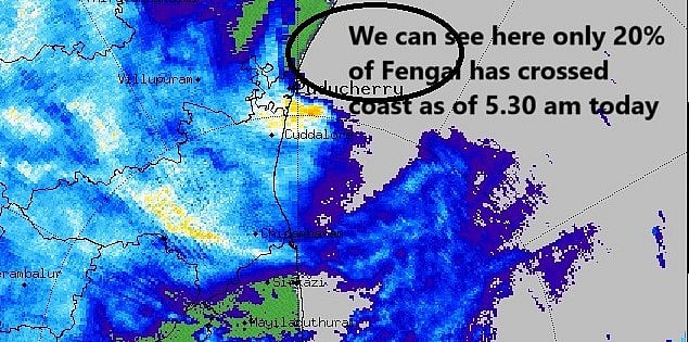 `ஃபெஞ்சல் புயல் கடலில் நிலைகொண்டுள்ளது. அது இன்னும் கரையைக் கடக்கவில்லை (கீழே கொடுக்கப்பட்டுள்ள செயற்கைக்கோள் படங்களை கவனிக்கவும்). இன்று (டிச.1) மதியம் அல்லது மாலை அளவில் ஃபெஞ்சல் கரையைக் கடக்கக்கூடும் என எதிர்பார்க்கப்படுகிறது.