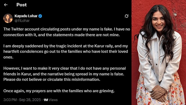 இதையடுத்து, கரூர் கூட்ட நெரிசலில் தன் நெருங்கிய நண்பரைக் இழந்துவிட்டதாகவும், விஜயின் சுயநல அரசியலுக்குப் பொதுமக்கள் பலியாடுகள் கிடையாது என்று நடிகை கயாது லோஹரின் பெயரில் கருத்து ஒன்று பரவியது.