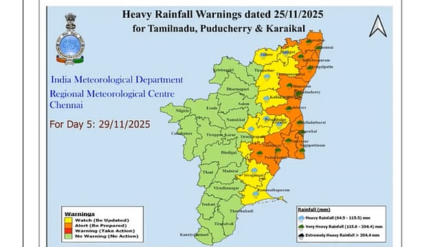 தமிழ்நாட்டில் நவம்பர் 29 அன்று 11 மாவட்டங்களுக்கு மிக கனமழைக்கான ஆரஞ்சு எச்சரிக்கை விடுத்து சென்னை வானிலை ஆய்வு மையம் அறிவித்துள்ளது.