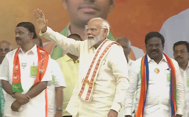 தமிழ்நாட்டில் மக்களவைத் தேர்தலுக்கு இன்னும் 9 நாள்களே உள்ள நிலையில், தேர்தல் பிரசாரம் தீவிரமடைந்துள்ளன. பிரதமர் நரேந்திர மோடி இருநாள் பயணமாக மஹாராஷ்டிரத்திலிருந்து தனி விமானம் மூலம் நேற்று தமிழ்நாடு வந்துள்ளார். மாலை 6 மணியளவில் சென்னை விமான நிலையம் வந்தடைந்த பிரதமர் மோடியை, பாஜக மாநிலத் தலைவர் அண்ணாமலை, மத்திய இணை அமைச்சர் எல். முருகன் உள்ளிட்டோர் வரவேற்றார்கள்.
