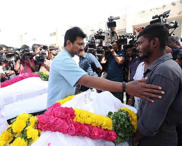 தமிழக வெற்றிக் கழகத் தலைவர் விஜய் கரூரில் சனிக்கிழமை பிரசாரம் மேற்கொண்டார். அப்போது கூட்டநெரிசல் ஏற்பட்டு மயக்கம் மற்றும் மூச்சுத் திணறல் காரணமாக 39 பேர் உயிரிழந்துள்ளார்கள். உயிரிழந்தவர்கள் குடும்பத்துக்கு முதல்வர் மு.க. ஸ்டாலின் நள்ளிரவில் ஆறுதல் கூறினார். குடும்பத்தினருடன் துபாய் சென்றிருந்த துணை முதல்வர் உதயநிதி ஸ்டாலின், நள்ளிரவில் கிளம்பி இன்று காலை கரூர் வந்தடைந்தார். கரூர் அரசு மருத்துவமனையில் நேரில் ஆய்வு செய்து மருத்துவர்களிடம் நிலைமை குறித்து அவர் கேட்டறிந்தார்.