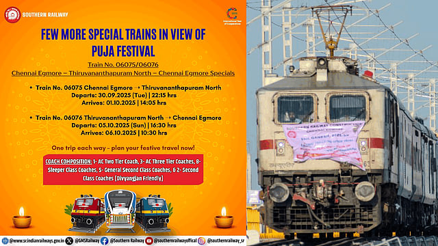 ரயில் எண் 06075 சென்னை எழும்பூரில் இருந்து நாளை (செப். 30) இரவு 10:15 மணிக்குப் புறப்பட்டு, மறுநாள் (அக். 1) பிற்பகல் 2:05-க்கு திருவனந்தபுரத்தை அடையும். மறுமார்க்கத்தில் ரயில் எண் 06076, அக்டோபர் 5 அன்று மாலை 4:30 மணிக்குப் புறப்பட்டு, அக்டோபர் 6 அன்று காலை 10:30 மணிக்கு சென்னையை வந்தடையும். இந்த ரயில் பெரம்பூர், திருவள்ளூர், அரக்கோணம், காட்பாடி, ஜோலார்பேட்டை, சேலம், ஈரோடு, திருப்பூர், பாலக்காடு, திருச்சூர், கோட்டயம், கொல்லம் வழியாகச் செல்லும்.