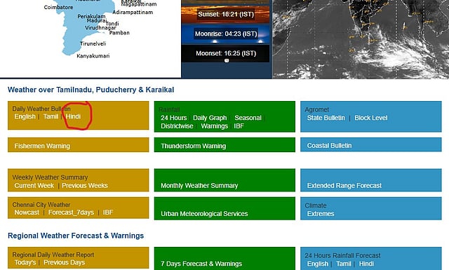 `தமிழ்நாடு, புதுச்சேரி, காரைக்கால் பகுதிகளுக்கான வானிலை முன்னறிவிப்பை வழங்கும் சென்னை மண்டல வானிலை மையம் தனது அன்றாட வானிலை அறிக்கையை ஹிந்தியிலும் வழங்கத் தொடங்கியுள்ளது.