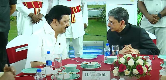 இதன்படி, ஆளுநர் மாளிகையில் இன்று மாலை நடைபெற்ற சுதந்திர தின விழாவில் முதல்வர் மு.க. ஸ்டாலின் கலந்துகொண்டார். ஆளுநர் ஆர்.என். ரவி முதல்வரை வரவேற்றார். சுதந்திரப் பொன் விழா அரங்கில் நடைபெற்ற கலை நிகழ்ச்சிகளைத் தொடர்ந்து, தேநீர் விருந்து நடைபெற்றது. இதில் முதல்வர் மு.க. ஸ்டாலின், சட்டப்பேரவைத் தலைவர் அப்பாவு, மூத்த அமைச்சர் துரைமுருகன், தலைமைச் செயலர் சிவ் தாஸ் மீனா உள்ளிட்டோர் ஆளுநர் அமர்ந்த வட்டமேசையில் அமர்ந்து கலந்துகொண்டார்கள்.