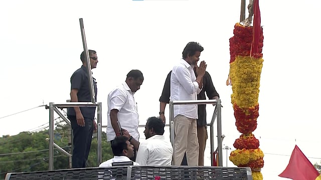 இந்நிலையில், அடுத்தகட்டமாக திருவாரூரில் பிரசாரம் செய்ய வருகை தந்தார். அங்கு தெற்கு வீதியில் அவர் பிரசாரம் செய்ய காவல்துறை அனுமதி வழங்கியது. அப்பகுதிக்குப் பிரசார வாகனத்தில் விஜய் வந்த நிலையில், வழி நெடுகிலும் தொண்டர்கள் திரளாகக் குவிந்ததால் வாகனம் மெதுவாக நகர்கிறது. நடுவில், விஜய்க்குத் தொண்டர்கள் சார்பில் கிரேன் மூலம் பிரம்மாண்ட மாலை அளிக்கப்பட்டது. அதனை வாகனத்திற்கு மேலே வந்த விஜய் பெற்றுக் கொண்டார். தொடர்ந்து பரப்புரை செய்ய வேண்டிய இடத்திற்கு அவர் வந்து கொண்டிருக்கும் நிலையில், ரசிகர்கள் குவிந்துள்ளதால் தாமதம் ஏற்பட்டுள்ளது.