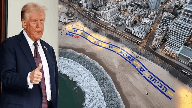 இந்நிலையில், இஸ்ரேல் வந்திறங்கிய அமெரிக்க அதிபர் டிரம்பையும் மக்கள் உற்சாகமாக வரவேற்றனர். அவர் வருகையை ஒட்டி டெல் அவிவின் கடற்கரையில் பிரமாண்டமான நன்றிப் பதாகையை வைத்து டிரம்பை வரவேற்றனர். அதிபர் டிரம்ப் தரையிறங்கும்போதே விமானத்தில் வரவேற்புச் செய்தி ஒலிபரப்பப்பட்டது. அதில், “இஸ்ரேலுக்கு உங்களை வரவேற்கிறோம். உங்கள் வருகை எங்கள் மக்களின் ஆழமான நம்பிக்கையை அளிக்கிறது. தங்களது நட்பு மற்றும் இரு நாடுகளுக்கு இடையிலான அசைக்கமுடியாத உறவுக்காக எங்கள் நன்றி. கடவுள் அமெரிக்காவையும் இஸ்ரேலையும் காக்கட்டும்” என்று வரவேற்புச் செய்தி ஒலிபரப்பட்டது. இதை வானில் இருந்தபடியே டிரம்ப்பின் தனி விமானம் ஏற்றுக்கொண்டது.