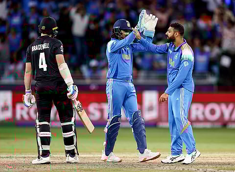 இந்திய அணிக்கு எதிர்பாராதவிதமாக நல்ல தொடக்கம் அமையவில்லை. 7 ஓவர்களுக்குள் ரோஹித் சர்மா, ஷுப்மன் கில், விராட் கோலியின் விக்கெட்டுகளை இழந்தது. பிலிப்ஸின் மகத்தான கேட்சால் 11 ரன்களுக்கு ஆட்டமிழந்தார் கோலி. இது அவருடைய 300-வது ஒருநாள் ஆட்டம். 4-வது விக்கெட்டுக்கு ஜோடி சேர்ந்த ஷ்ரேயஸ் ஐயரும் அக்ஷர் படேலும் 29-வது ஓவர் வரை விக்கெட் இழக்காமல் பார்த்துக்கொண்டார்கள். 43 ரன்கள் எடுத்த அக்ஷர், ரச்சின் ரவீந்திரா பந்தில் ஆட்டமிழந்தார். நன்கு விளையாடிய ஷ்ரேயஸ் ஐயர், 98 பந்துகளில் 79 ரன்கள் எடுத்து வெளியேறினார். கடைசி 10 ஓவர்களில் பாண்டியா ரன்கள் சேர்க்க உதவினார். 45 ரன்கள் எடுத்துக் கடைசி ஓவரில் அவர் ஆட்டமிழந்தார். இந்திய அணி 50 ஓவர்களில் 249 ரன்கள் எடுத்தது. மேட் ஹென்றி 5 விக்கெட்டுகளை வீழ்த்தினார்.