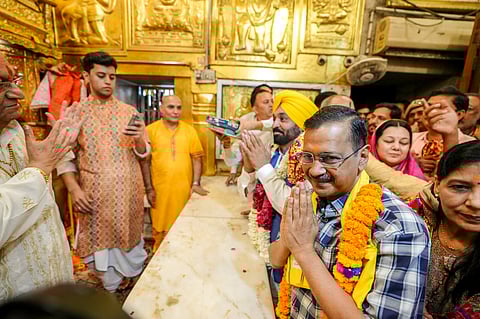 சாமி தரிசனத்தை முடித்துக்கொண்டு ஆம் ஆத்மி அலுவலகத்துக்குச் சென்றார் அரவிந்த் கெஜ்ரிவால்.